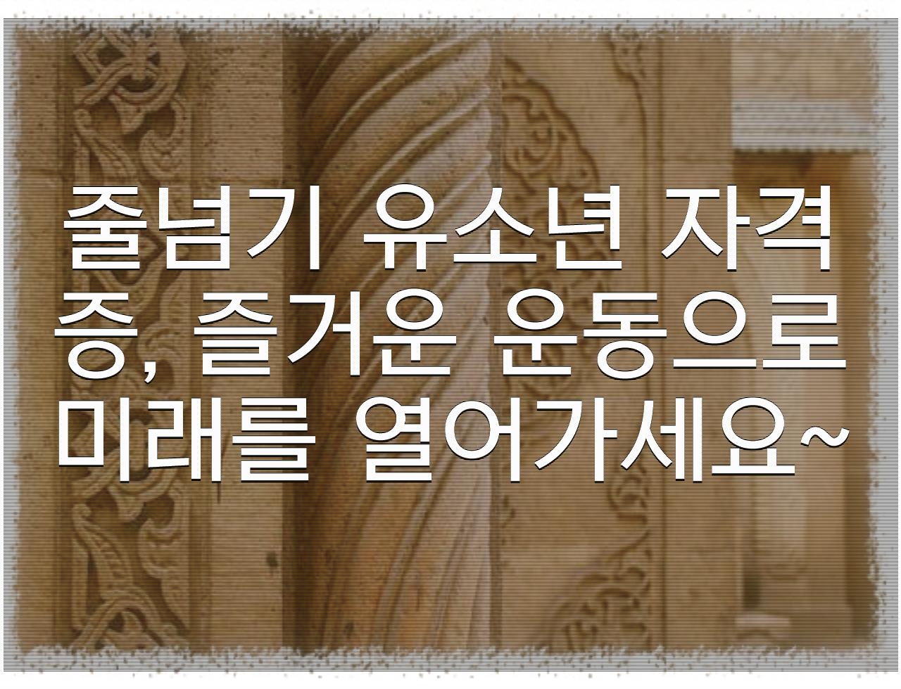 줄넘기, 누구나 쉽게 즐길 수 있는 운동이죠? 이제 줄넘기를 더욱 체계적으로 배우고, 아이들에게 재미있게 가르쳐 줄 수 있는 기회를 잡아보세요~ 바로 줄넘기 유소년 자격증입니다. 줄넘기 유소년 자격증은 단순한 운동 기술 뿐만 아니라, 아이들과 소통하고 성장을 돕는 전문 지도자가 되기 위한 첫걸음입니다. 자~ 그럼, 줄넘기 유소년 자격증, 즐거운 운동으로 미래를 열어가세요~ 정리하여 드립니다.